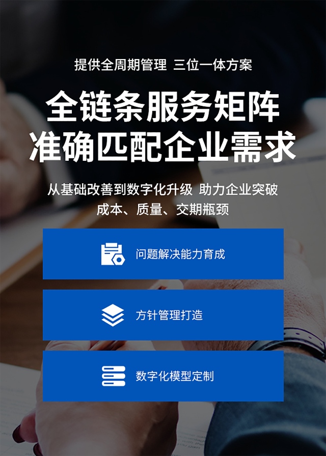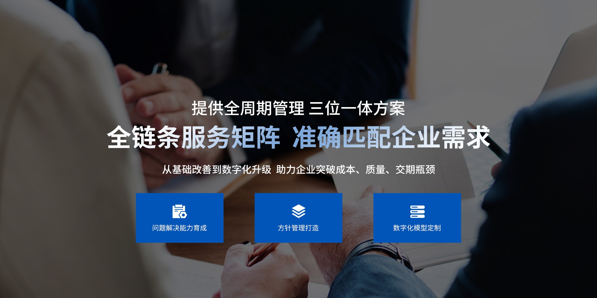 提供 “问题解决能力育成+方针管理打造+数字化模型定制” 三位一体方案,助力企业突破成本、质量、交期瓶颈。